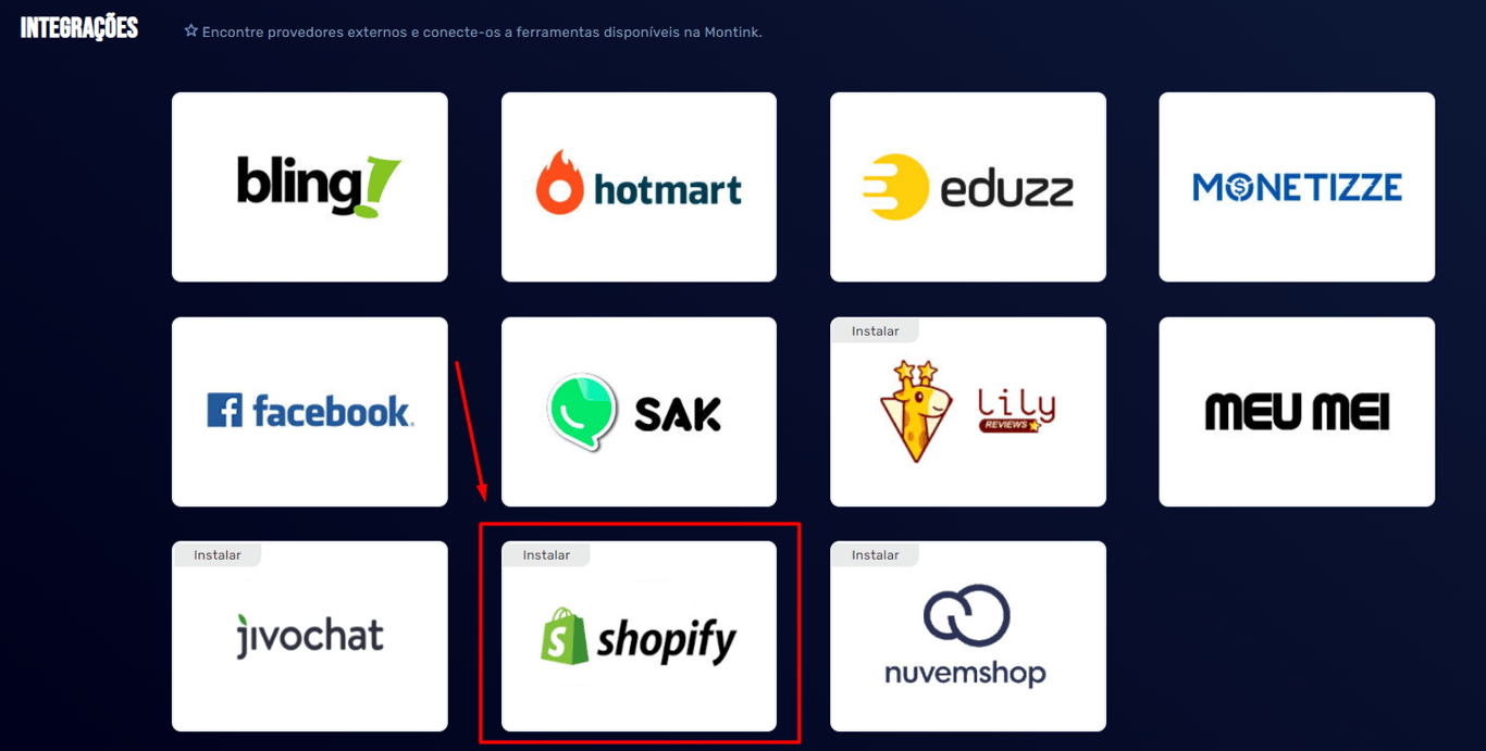 Para conferir essa novidade, basta acessar o menu lateral da sua loja e seguir a rota Configurações > Integrações > Shopify. Caso prefira, clique aqui para acessar a página de integrações.